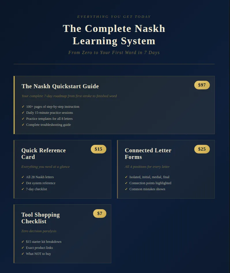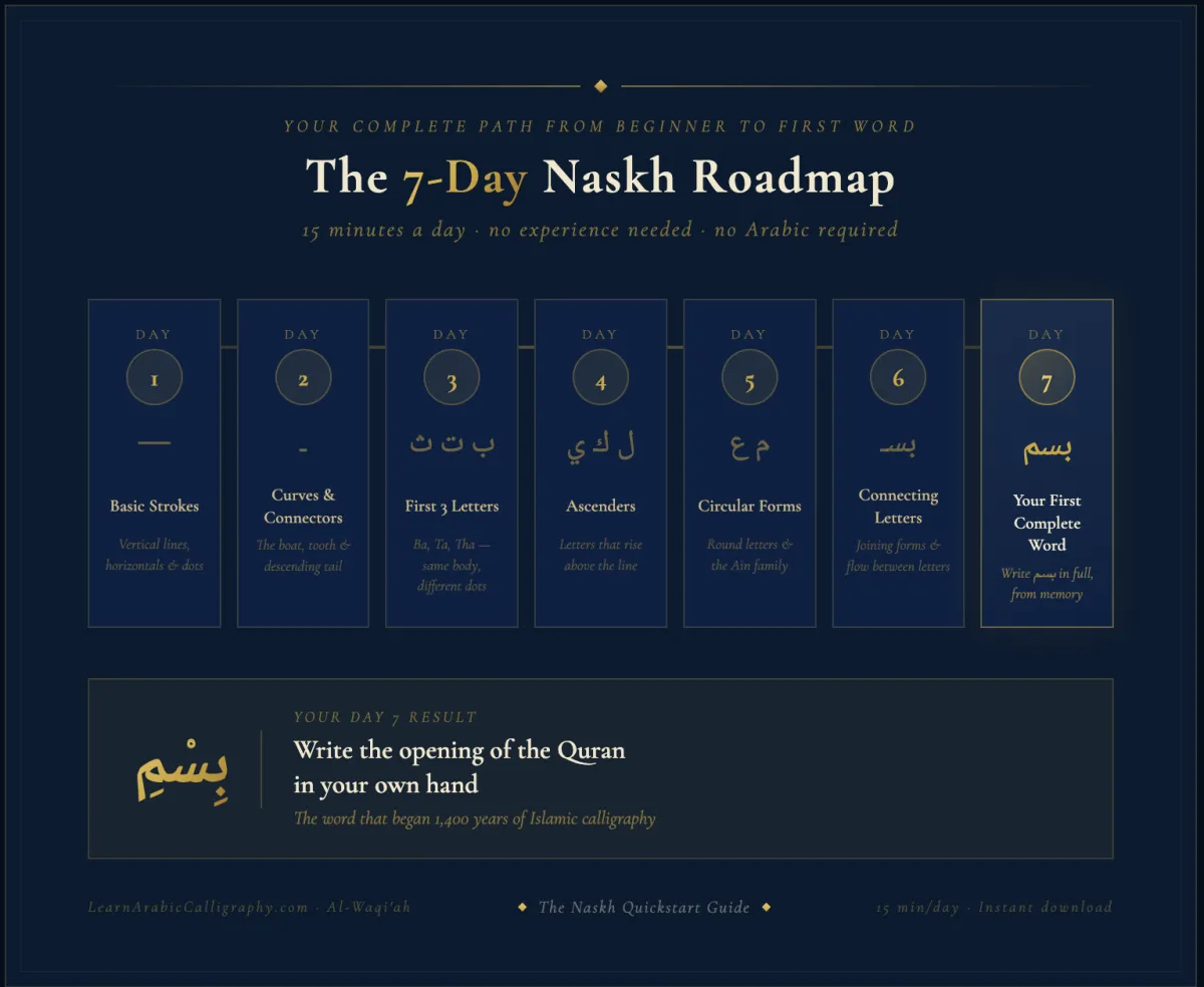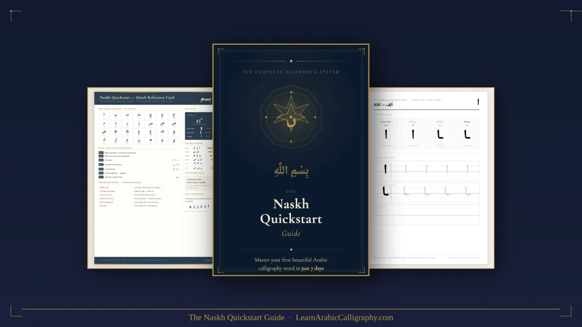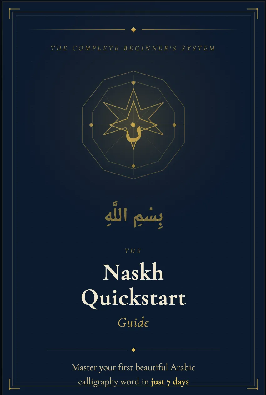 The Naskh Quickstart Guide is a complete, step-by-step beginners' system for learning Arabic calligraphy from zero.