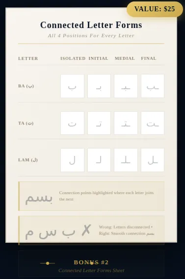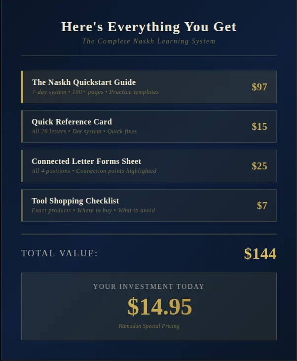 P.S. Remember what this guide actually delivers: in 7 days of 15-minute sessions, you will produce a complete Arabic calligraphy word that you can photograph, print, and share.