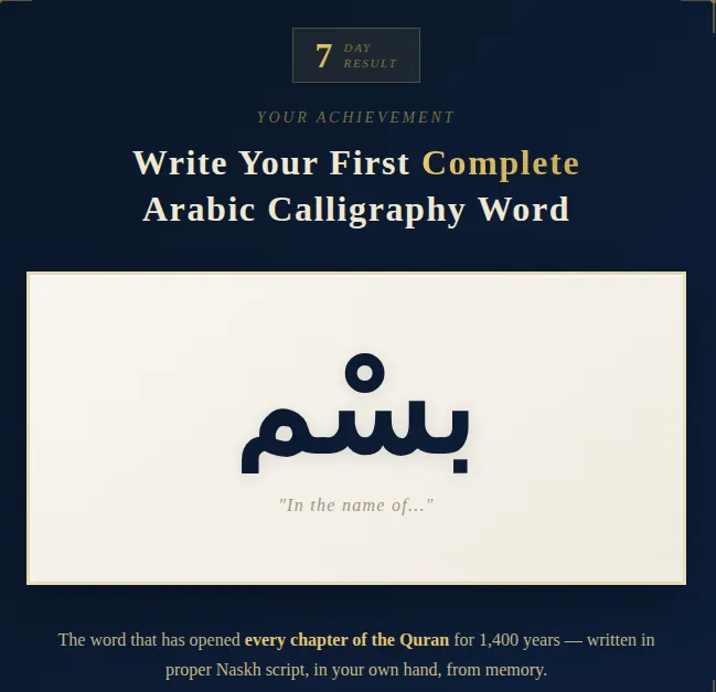 Day 7: Your First Complete Word — بسم — Bism, meaning "in the name of." The word that has opened every chapter of the Quran for 1,400 years. Written in your handwriting.